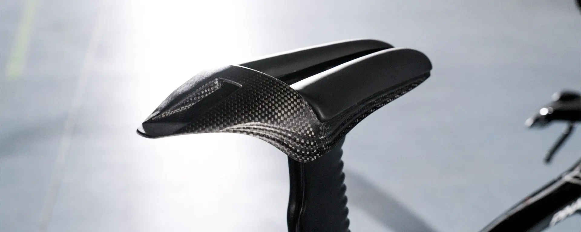 De Predator 01TT is een gepatenteerd tijdrit- en triathlonzadel, ontwikkeld met WorldTour-teams en verfijnd via CFD-simulatie en windtunneltesten. Een geïntegreerde carbon plaat vervangt de traditionele rails voor directere vermogensoverdracht en meer stuurprecisie. De modulaire constructie maakt plaat en basis scheidbaar voor vervanging en recyclage.